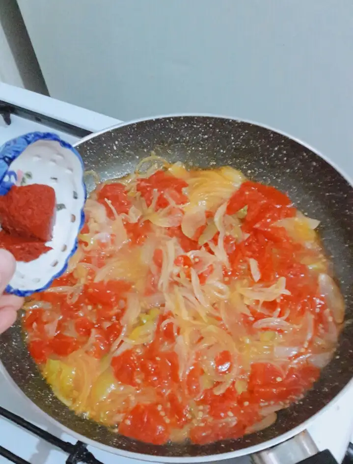 Ardindan biberi ekliyip yumusayana kadar pisiriyoruz ve son olarak dogradiğimiz 1 adet orta boy domatesi ekliyip tuzunu atip agzini kapatiyoruz.. 3 4 dk pisirdikten sora salcayi ekliyip 2 dk daha pisirip altini kapatiyoruz.
