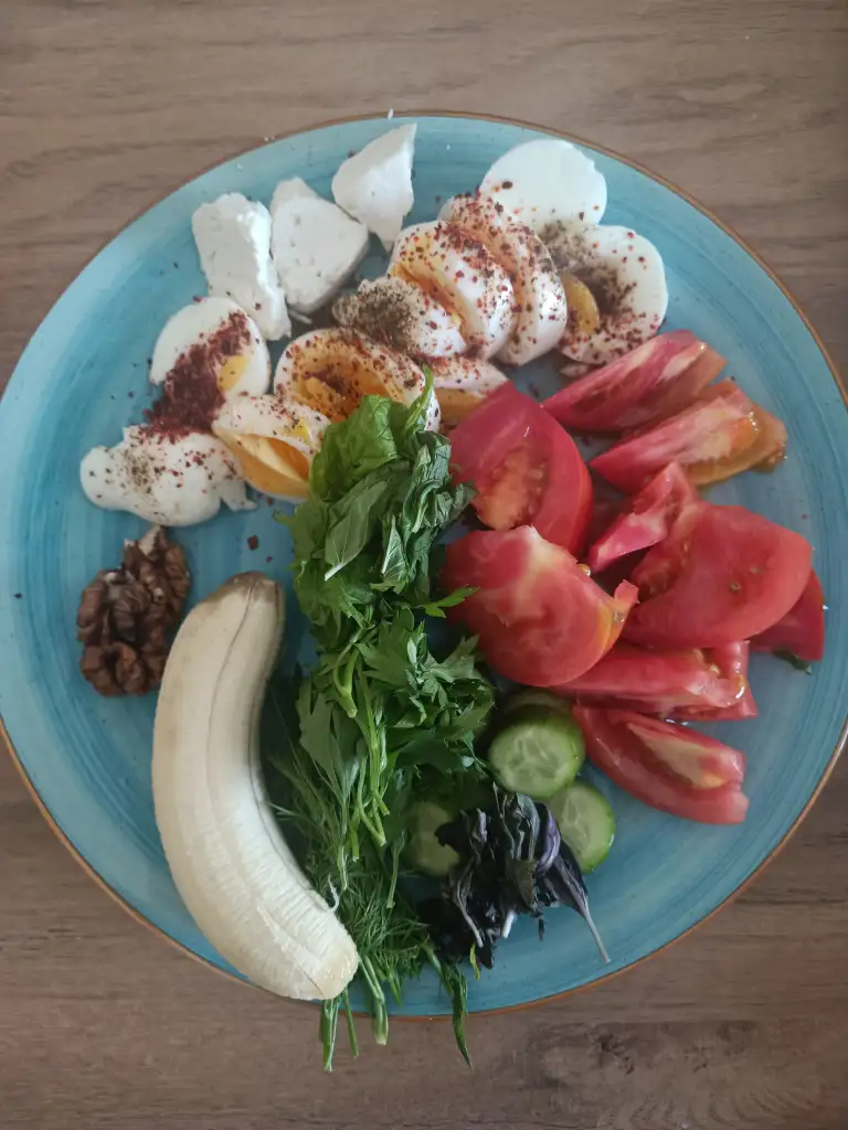 Grubun işleyişi nasıl bilmiyorum ama yaklaşık 400 kalorilik kahvaltım. Sağlıklı yağ olarak ceviz ve yumurta sarısını kullanıyorum. Ceviz olan gün zeytin yok. Protein olarak yağsız peynir ve yumurta beyazı. Karbonhidrat olarak muz. Hem de potasyum kaynağı olduğu için kaslarıma iyi geliyor. Kabızlığı önlemesi, gözümü doyurması ve midede hacim yapması için de bol bol sebze ve yeşillik. Belki bir dilim de ekşi mayalı tam buğday ekmeği yerim.